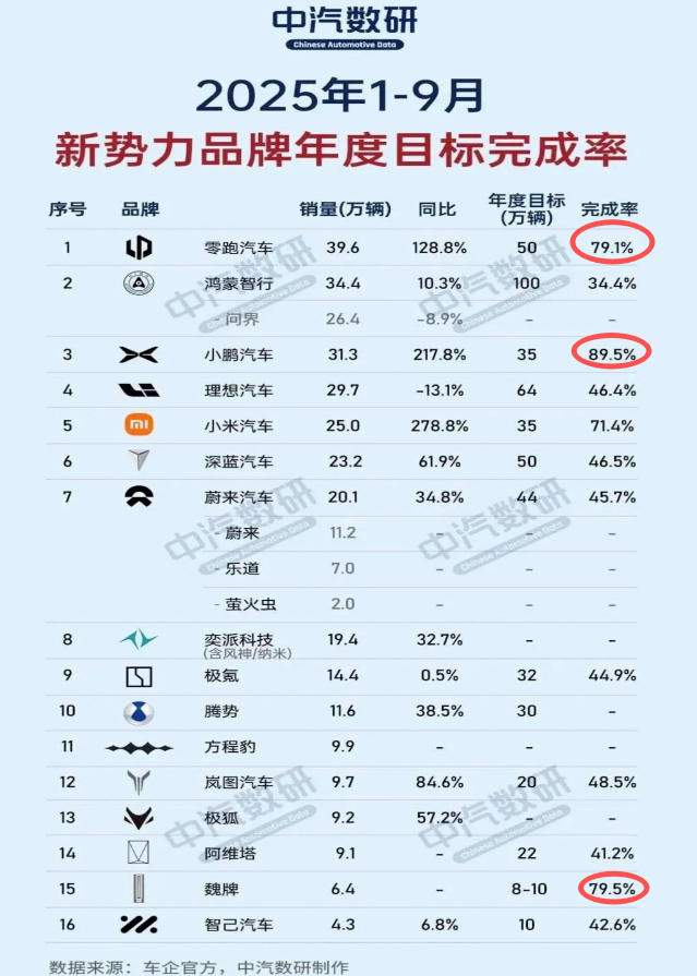 并且从目标来看,大家都是较大的,而如今2025年已经过去了9个月,根据各大车企的官方数据,机构做出了一张年度目标完成率的表。