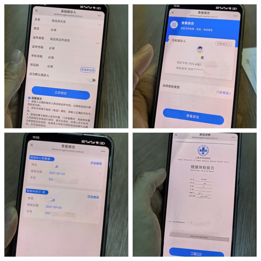 通过填入姓名和身份证号,记者顺利添加了他人为就诊人,并在页面显示为“已认证”状态,且系统自动关联了该身份证此前就诊时使用的医院就诊卡。“实名认证的用户可查看历史线上就诊记录”,随后,记者顺利查看到了被添加者于2021年在同济医院所做的多项检查的报告以及2021年9月的全套体检报告,并且还可下载PDF文件。
